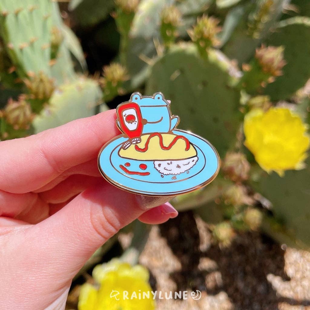 Omelet? omelette? omelet? how do you even spell this word. Son the Frog making some delicious omurice. He has drawn a deranged little smiley face out of Definitely Ketchup (which is Definitely Not Blood). * 1.5 inch hard enamel pin * 2 rubber backs * wakey wakey eggs and bakey :)